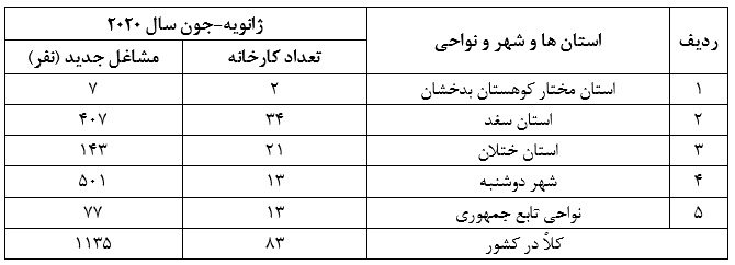 طبق اطلاعات آماری، در دوره گزارشی در کشور 83 کارخانه جدید صنعتی با ایجاد مشاغل برای 1135 احداث و مورد بهره برداری قرار گرفت. از جمله: