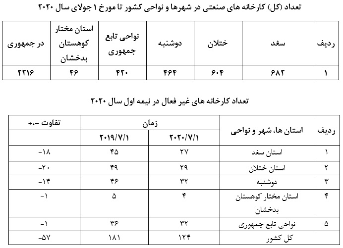 تعداد کارخانههای از فعالیت بازمانده نسبت به دوره مشابه سال گذشته 57 کارخانه کاهش یافته است. در دوره گزارشی کارخانههای شرکت دارای مسئولیت خاص «بافنده نارک» شهر نارک، شرکت دارای مسئولیت خاص «دلکشا» ناحیه مؤمن آباد، شرکت دارای مسئولیت «سامان FM» ناحیه عبدالرحمان جامی، شرکت دارای مسئولیت خاص «ثمر» ناحیه واسع، شرکت دارای مسئولیت خاص «نظیری» ناحیه شمس الدین شاهین، شرکت دارای مسئولیت خاص «زرین ک» ناحیه سنگوار و شرکت سهامی عام «کارخانه تولید آلکول» شهر اسفره فعالیت خود را آغاز کرده اند.