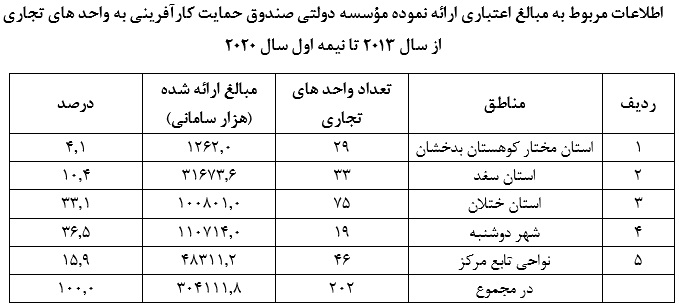 تبصره: مؤسسه فوق طی شش ماهه اول سال 2020 به 12 واحد تجاری به میزان 33.7 میلیون سامانی، از جمله 7 طرح تجاری واحدهای تجاری جهت تاسیس کارگاه و کارخانه به مبلغ 27.2 میلیون سامان و 5 طرحهای تجاری واحدها را جهت تجدید کارگاه و کارخانه به مبلغ 6.5 میلیون سامانی حمایت نموده، وام های دارای امتیاز میان مدت اختصاص داده است که برای حوزههای تولید محصولات خیاطی، ساخت و ساز انبار و سردخانه ، تاسیس کارخانههای تولید در و پنجرههای پلاستیکی و نردههای آهنی، تاسیس کارخانه تولید بستنی، فراوری میوه خشک، تاسیس مجتمع پرورش طیور، تجدید کارخانه تولیدی آب معدنی، بسته بندی نباتات درمانی ارائه شده اشت.