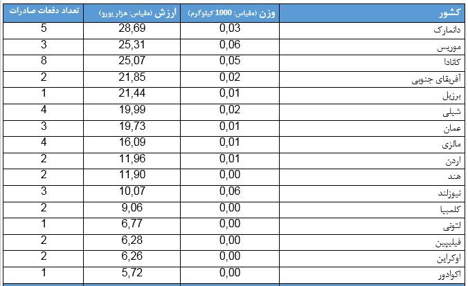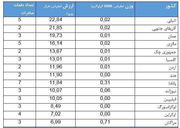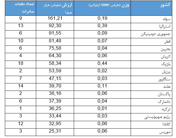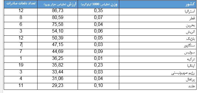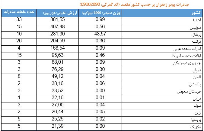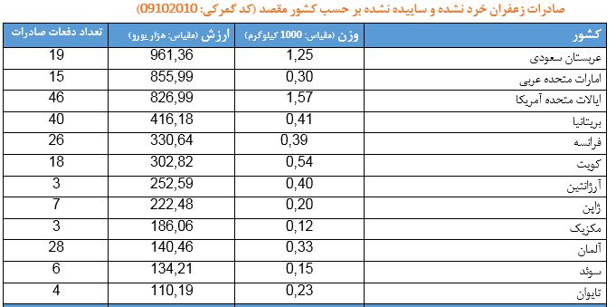 بیشترین حجم صادرات زعفران اسپانیا به امارات متحده عربی (1 میلیون و 24 هزار و 530 یورو)، عربستان سعودی (994 هزار و 890 یورو) و ایالات متحده آمریکا (922 هزار و 610 یورو) بوده است.