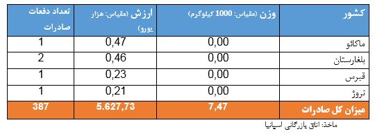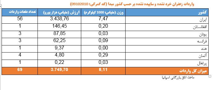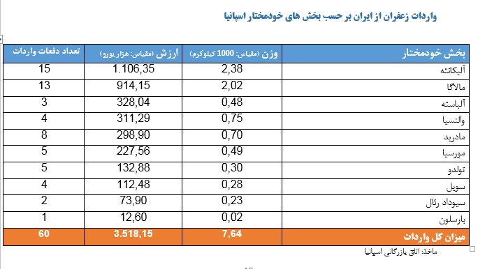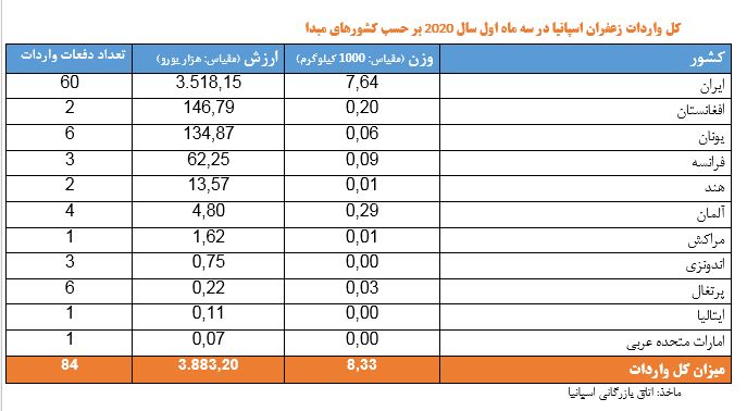 جمهوری اسلامی ایران به عنوان بزرگ ترین تامین کننده زعفران اسپانیا در سه ماهه دوم سال جاری میلادی، 7 هزار و 640 کیلوگرم زعفران به ارزش 3 میلیون 518 هزار 150 یورو به اسپانیا صادر کرده است. تراز تجاری اسپانیا در بخش زعفران در سه ماه اول سال 2020 مثبت4 میلیون و 328 هزار و 950 یورو میباشد.