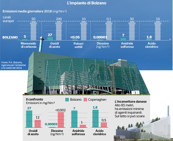 در نمودار پایین، ستون سبز رنگ گازهای متصاعد شده از نیروگاه بولزانو را نشان می دهد درحالیکه ستون صورتی رنگ گازهای خروجی از نیروگاه کپنهاگ را به نمایش میگذارد.
