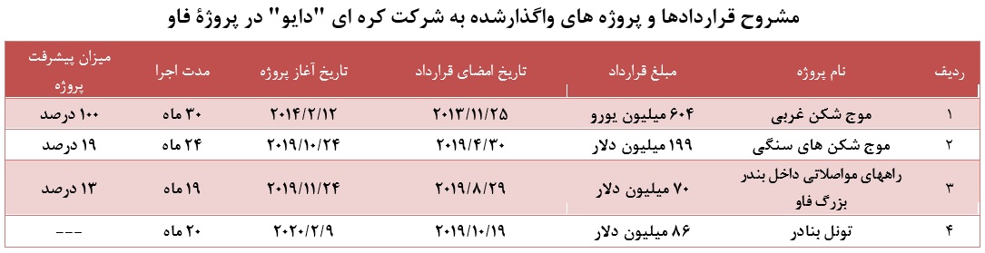 شرکت کره ای "دایو" در راستای اجرای بخشی دیگر از زیرساختهای مربوط به طرح بندر بزرگ فاو با شرکت بنادر عراق اخیراً قراردادهایی را به شرح ذیل به امضاء رسانده است. لازم به ذکر است که سال گذشته با موافقت وزارت برنامه ریزی عراق مبلغ 400 میلیارد دینار عراقی از بودجه سال 2019 برای اجرای بخشی از زیرساخت های بندر بزرگ فاو اختصاص یافته بود.