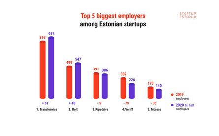 به عبارت دیگر در نیمه اول سال 2020 تعداد 20 استارت آپ برتر استونی به عنوان کارفرمایان برتر به میزان 56 درصد شغل جدید ایجاد کردند. از میان استارت آپ های برتر میتوان به Transferwise با 954 کارمند و 61 استخدام جدید، Bolt با 547 کارمند و 48 استخدام جدید ، Pipedrive با 386 کارمند ، Veriff با 226 کارمند و Monese با 140 کارمند اشاره نمود.