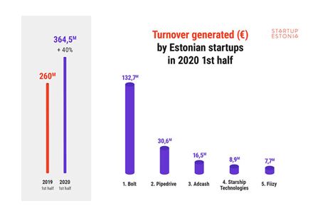 در نیمه اول سال 2020 ، استارت آپ های استونی به میزان 364 میلیون و 500 هزار یورو گردش مالی ایجاد کردند که نسبت به مدت مشابه سال قبل ( 2019 ) که به میزان 260 میلیون یورو بوده به میزان 40 درصد افزایش داشته است. در عین حال، باید در نظر داشت که شیوع COVID-19 تأثیر خود را بر گردش مالی شرکت های استارت آپی در استونی نیز گذاشته است. فقط مقایسه سه ماهه دوم با سه ماهه اول سال 2020 نشان می دهد که حدود 17 درصد از گردش مالی شرکت های استارت آپی در سه ماهه دوم کاسته شده است.