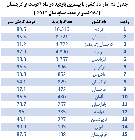 بیشترین تعداد، 16،316 بازدید کننده در ماه آگوست از ترکیه به گرجستان بوده است، در حالی که تعداد بازدید کنندگان ترک نسبت به سال قبل 89٪ کاهش یافت.