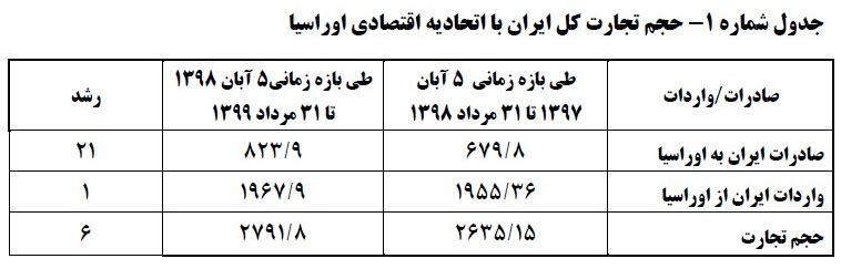 بر اساس جدیدترین گزارش سازمان توسعه تجارت ایران از تجارت جمهوری اسلامی ایران با اتحادیه اقتصادی اوراسیا ، حجم واردات و صادرات در بازه زمانی ۵ آبان ۹۸ تا ۳۱ مرداد ۹۹ نسبت به مدت مشابه (۵ آبان ۹۷ تا ۳۱ مرداد ۹۸) رشد ۶ درصدی داشته است. رشد ۲۱ درصدی صادرات و افزایش یک درصدی واردات حاصل تلاش تجار ایرانی و اتحادیه اوراسیا در فاصله زمانی یاد شده می باشد .
