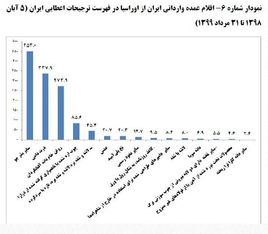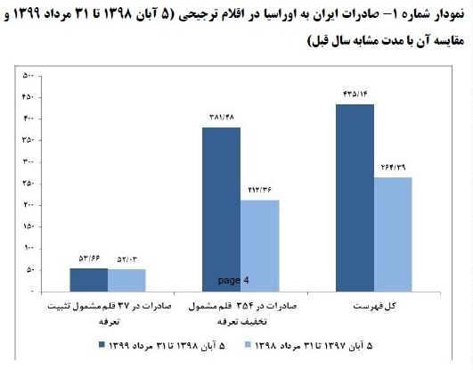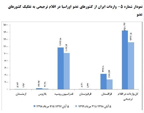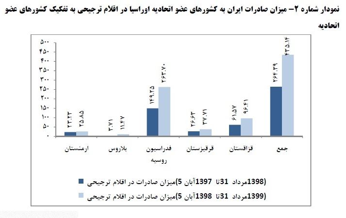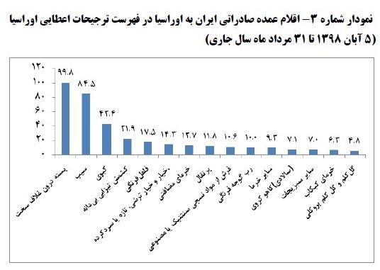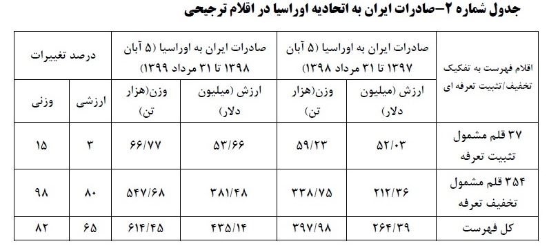 مقایسه کل صادرات ایران به اوراسیا با میزان صادرات ایران به اوراسیا در اقلام ترجیحی نشان میدهد صادرات ایران در اقلام ترجیحی طی بازه زمانی ۵ آبان ۹۸ تا ۳۱ مرداد ۹۹ تقریبا ۵۳ درصد کل صادرات به این اتحادیه را به خود اختصاص داده است. نکته مهم این است که از ۱۵ قلم عمده صادراتی ایران به اوراسیا در فهرست مذکور طی دوره مورد بررسی ۱۴ ردیف تعرفه از جمله پسته، سیب، فلفل فرنگی، خیار و خیارترشی، خرما مضافتی، خرمای کبکاب، پرتقال، رب گوجه فرنگی، کاهوی کروی، سایر سبزیجات، سایر کلم و گل کلم بروکلی، انگور تازه و مغز پسته مشمول تخفیف تعرفهای به کشورمان شدهاند و تنها کیوی برای ایران تثبیت شده است.