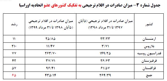 بر اساس آمارهای اعلام شده از سوی گمرک، بیشترین میزان صادرات در اقلام ترجیحی به روسیه و کمترین میزان صادرات به بلاروس بوده است. میزان صادرات ایران در اقلام ترجیحی به تفکیک کشورهای عضو اتحادیه اوراسیا نشان میدهد ارزش صدور این گروه از کالاها به ارمنستان با رشد ۱۱ درصدی نسبت به بازه مشابه (۵ آبان ۹۷ تا ۳۱ مرداد ۹۸) به ۲۵میلیون و ۸۵۰ هزار دلار در بازه زمانی ۵ آبان ۹۸ تا ۳۱ مرداد ۹۹ رسیده است. بلاروس در همین مدت زمان خریدار ۱۱ میلیون و ۴۷۰ هزار دلار کالای ایرانی بوده که نسبت به مدت مشابه (۵ آبان ۹۷ تا ۳۱ مرداد ۹۸) رشد ۲۱۰ درصدی را در صادرات به این کشور شاهد هستیم. بیشترین رشد صادراتی نیز مربوط به صدور کالا به بلاروس است. ارزش صادرات به روسیه در بازه زمانی ۵ آبان ۹۷ تا ۳۱ مرداد ۹۸ معادل ۱۴۹ میلیون و ۲۵۰ هزار دلار بوده که در بازه ۵ آبان ۹۸ تا ۳۱ مرداد ۹۹ به ۲۶۳ میلیون و ۷۰۰ هزار دلار رسیده و نشان از رشد ۷۷ درصدی در ارزش صادرات به روسیه دارد. ارزش صادرات اقلام ترجیحی به قرقیزستان از ۲۶ میلیون و ۶۳۰ هزار دلار در بازه زمانی ۵ آبان ۹۷ تا ۳۱ مرداد ۹۸ با رشد ۴۲ درصدی به ۳۷ میلیون و ۷۱۰ هزار دلار در بازه زمانی ۵ آبان ۹۸ تا ۳۱ مرداد ۹۹ رسیده است. صادرات به قزاقستان نیز رشد ۵۷ درصدی داشته و به ۹۶ میلیون و ۴۱۰ هزار دلار رسیده است. در بازه مشابه ایران صادراتی معادل ۶۱ میلیون و ۵۷۰ هزار دلار به این کشور داشته است.