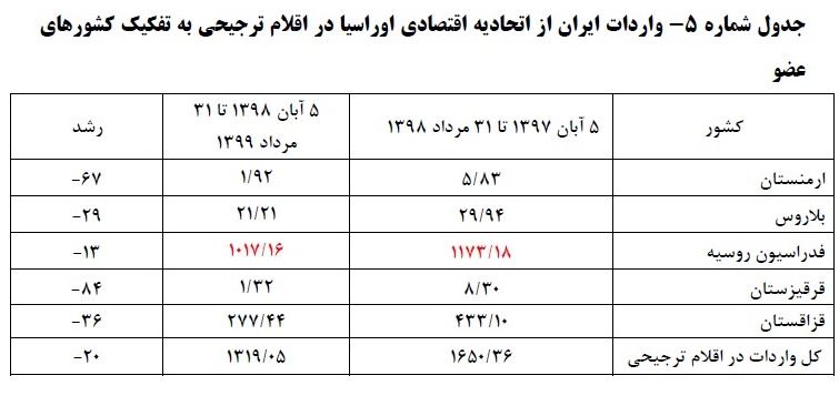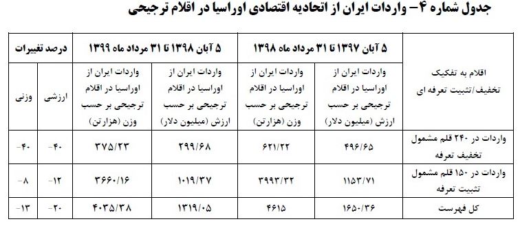 از مجموع یک میلیارد و ۳۱۹ میلیون دلار کل واردات ایران از اوراسیا در اقلام ترجیحی از ۵ آبان ۹۸ تا ۳۱ مرداد ۹۹، فقط میزان ۲۹۹ میلیون و ۶۸۰ هزار دلار معادل ۲۳ درصد واردات ایران از این اتحادیه، در اقلام ترجیحی مشمول تخفیف تعرفهای (۲۴۰ قلم) به آن اتحادیه شدهاند و یک میلیارد و ۱۹ میلیون و ۳۷۰ هزار دلار یعنی معادل ۷۷ درصد واردات در اقلامی بوده که هیچ تخفیف تعرفهای به اتحادیه اوراسیا تعلق نگرفته است (۱۵۰ قلم). یکی از دلایل کاهش واردات از آن اتحادیه نیز مربوط به محدودیتهای صادراتی اوراسیا به دلیل شیوع ویروس کرونا بوده است.