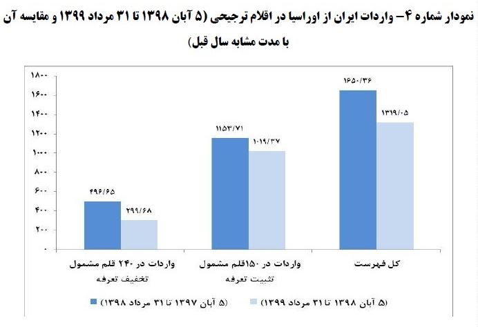 واردات از اوراسیا در ۲۴۰ قلم کالای مشمول تخفیف تعرفه در ۵ آبان ۹۷ تا ۳۱ مرداد ۹۸ معادل ۶۲۱ هزار و ۲۲۰ تن به ارزش ۴۹۶ میلیون و ۶۵۰ هزار بوده که با کاهش ۴۰ درصدی هم در وزن و هم در ارزش به ۳۷۵ هزار و ۲۳۰ تن به ارزش ۲۹۹ میلیون و ۶۸۰ هزار دلار در بازه زمانی ۵ آبان ۹۸ تا ۳۱ مرداد ۹۹ رسیده است.