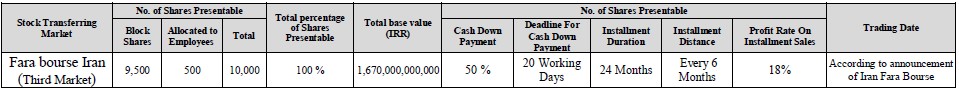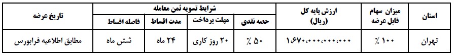 در این راستا، خلاصه آگهی عرضه نوبت اول در روزنامههای دنیای اقتصاد و همشهری در تاریخ 1399/07/30 منتشر و نوبت دوم در تاریخ 1398/08/07 منتشر شده است. اطلاعات تکمیلی عرضه مشتمل بر شرایط واگذاری و به ویژه نحوه بررسی صلاحیت متقاضیان، در پایگاه اطلاع رسانی این سازمان به نشانی www.ipo.ir، بخش فهرست آگهی دارایی و بنگاههای در حال عرضه، در دسترس میباشد.