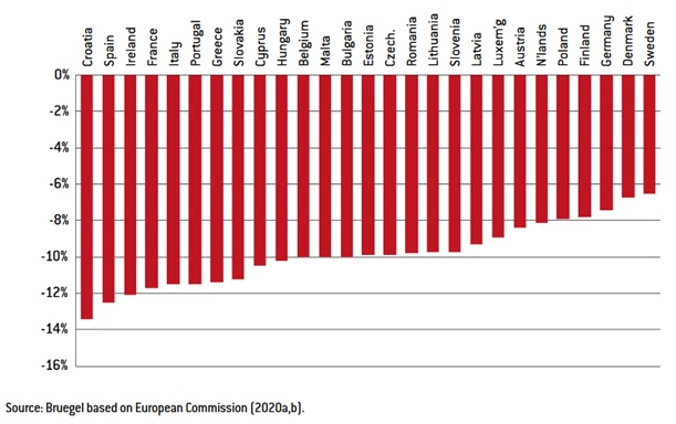 بحران اقتصادی ناشی از اپیدمیکووید 19 بر تمام کشورهای اتحادیه اروپا تأثیرگذاشته است. با این حال ، این تأثیر به طور مساوی توزیع نشده و در برخی کشورها تأثیرات آن بر اقتصاد به مراتب شدیدتر از برخی دیگر است. تحلیلگران موسسه بروگل با یک مدل نسبتاً ساده که فقط 4 عامل را در نظر میگیرد ، تفاوت در عمق بحران ناشی از کرونا در اقتصادهای مختلف اروپائی را توضیح داده اند.