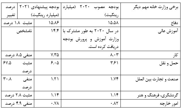 - وزارت کشور: وزارت کشور با دریافت بودجه ای به میزان 16.85 میلیارد رینگیت برای سال آینده سهمی معادل 5.23 درصد از کل رقم بودجه را دریافت میکند و نسبت به سال جاری در حدود 76 میلیارد رینگیت از بودجه آن کاسته شده است.