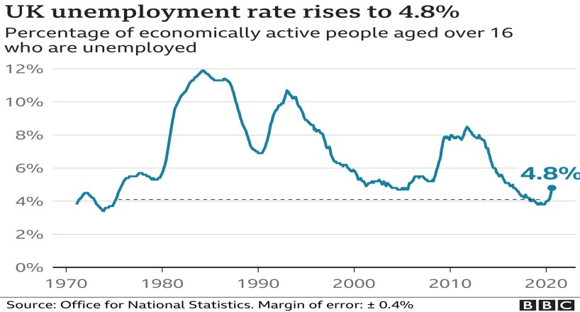 اداره آمار ملی بریتانیا[3] نرخ بیکاری کشور از جولای تا سپتامبر سالجاری را 4.8 درصد اعلام کرده است. اداره نظارت بر بودجه بریتانیا برای سال آینده، تعداد 3.5 میلیون بیکار را پیشبینی نموده است. ریشی سوناک وزیر خزانهداری بریتانیا درعین حال پیشبینی کرد که میزان نرخ بیکاری تا 7.5 درصد افزایش یابد و (در صورت تحقق شرایط اقتصادی مورد نظر) این نرخ در پایان سال ۲۰۲۴ به 4.4 درصد خواهد رسید.