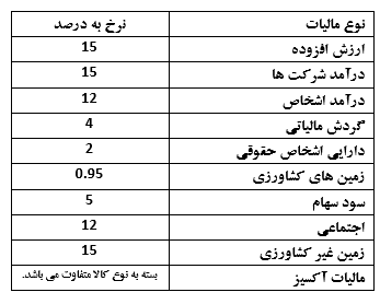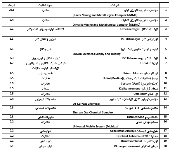 مالیات بعنوان یک عامل مهم در توسعه اقتصادی ازبکستان و از منابع اصلی بودجه این کشور از بدو استقلال تا زمان کنونی به شمار آمده است. بر اساس پیش نویس بودجه سال 2021 این کشور، میزان کل درآمد بودجه ای 147 تریلیون صوم(هر 10400 صوم معادل یک دلار میباشد) و میزان هزینهها 165 تریلیون صوم برآورد گردیده است. سهم پرداخت های مالیاتی در درآمد کل بودجه این کشور در سال 2021 در حدود 73 درصد معادل 109 تریلیون صوم در نظر گرفته شده است که 16 درصد از تولید ناخالص داخلی میباشد. بر اساس قوانین مالیاتی ازبکستان نرخ برخی از مالیات های پرداختی مستقیم و غیر مستقیم به شرح ذیل میباشد: