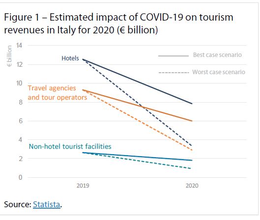 پیش بینی می‌شود صنعت گردشگری  که در اتحادیه اروپا در حدود 13 میلیون نفر را مشغول به کار نموده است، در حدود یک میلیارد یورو از درآمدهای ماهیانه خود را به دلیل شیوع ویروس کرونا از دست بدهد.  در بسیاری از کشورها مراکز تفریح عمومی از جمله هتل ها، رستورانها، تِم پارکها [2]و موزه‌ها تعطیل شدند. نمایشگاههای تجاری، رویدادهای فرهنگی نیز تعطیل و یا به زمان دیگر موکول گردید.  رویدادهای ورزشی از جمله  لیگ قهرمانان اروپا (2020) و بازی‌های المپیک به سال 2021 موکول گردید.  مراکز تفریحی اسکی (ریزوت ها) [3]سریع تر و قبل از پایان فصل زمستان بسته شدند. بسیاری از شرکت های کشتیرانی فعالیت هایشان را به تعویق انداختند و کشتی‌ها در دریاها سرگردان شدند چرا که بنادر از پذیرفتن آنها امتناع می‌کردند.  بسیار از کشورها شاخص های ورودی‌های مرزی خود را بازتعریف نمودند و از ورود برخی گردشگران به کشورهایشان ممانعت به عمل آمد که این مسئله بسیاری از گردشگران را برای بازگشت به کشورهایشان با مشکلات بسیاری روبه رو نمود.  مشکلات ایجاد شده توسط بحران کرونا در برخی از کشورهای اروپایی  که جز مقاصد اصلی گردشگری محسوب می‌شود از جمله ایتالیا، فرانسه و اسپانیا بیشتر دیده می‌شد  طبق بررسی و تخمین‌های فدراسیون گردشگری ایتالیا، این کشور حدود 60 درصد گردشگرانش را برای سال جاری از دست داده است. ( شکل یک).