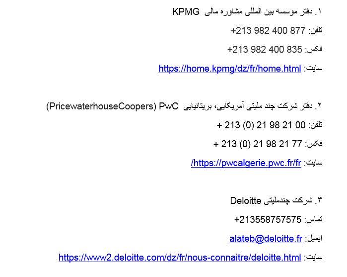 علاوه بر این دفاتر، سه شرکت بینالمللی و مشهور حوزه خدمات مالی یعنی KPMG ، Deloitte و PwC نیز در الجزایر دارای دفتر هستند که این شرکتها خدمات حسابرسی، مشاوره مالی و سرمایهگذاری ارائه میکنند. با توجه به شهرت و برند جهانی این شرکتها، هزینه خدمات آنها به نسبت بالا و قابل توجه است.