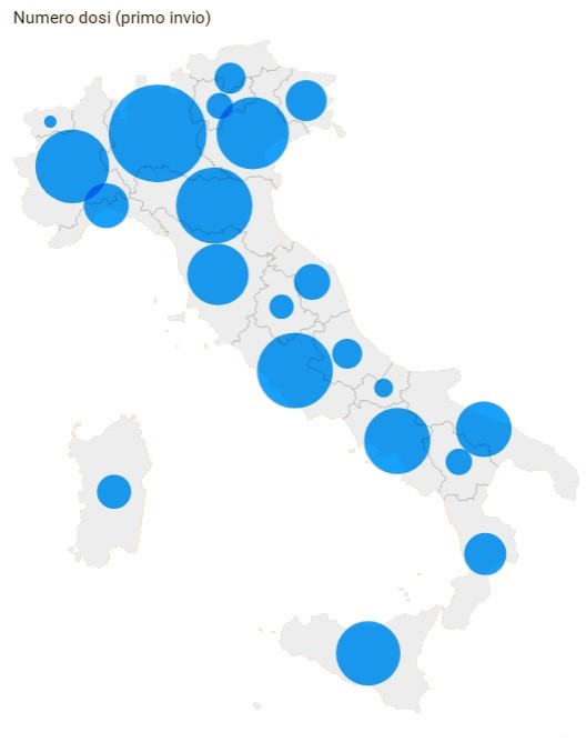 بر اساس اطلاعات تایید نشده قرار است از واکسنهای وارداتی از فایزر در استانها به ترتیب میزان آلودگی و سطح گسترش ویروس استفاده شود. بر همین اساس روزنامههای امروز ایتالیا اعلام کردهاند قرار است از استان لومباردی با بیشترین میزان ابتلا در مرحله نخست در حدود 189 هزار واکسن توزیع شود. بعد از آن در استان امیلیا رومانا 183 هزار ، لاتزیو 180 هزار و پیه مونته 170 هزار واکسن توزیع شود.