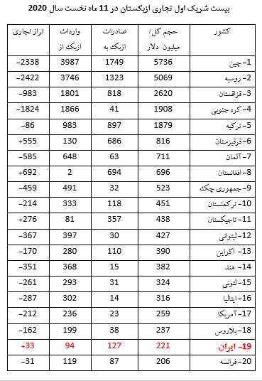 آمار تجارت خارجی ازبکستان در 11 ماه نخست سال 2020