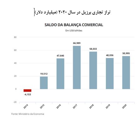 وزارت اقتصاد برزیل با گذشت چند روز از شروع سال 2021 آمار اولیه تجارت خارجی سال 2020 را منتشر کرد. بر اساس این آمار رقم کل تجارت خارجی برزیل در سال 2020 به 369 میلیارد دلار رسید که کاهش 7.7 درصدی نسبت به سال 2019را نشان می دهد. میزان صادرات برزیل با کاهش 6.1 درصدی به 210 میلیارد دلار و میزان واردات نیز با کاهش 9.7 درصدی به 159 میلیارد دلار رسید ولی تراز مثبت تجاری این کشور رشد 6.2 درصدی به رقم 51 میلیارد دلار افزایش یافته است.