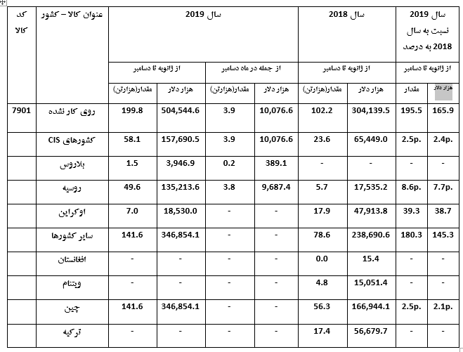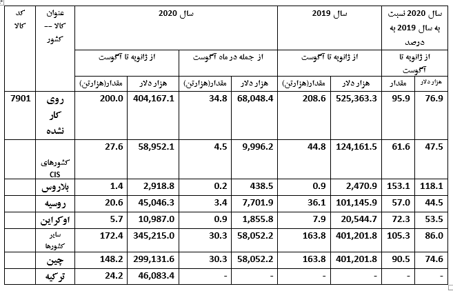آمار صادرات روی در قزاقستان مربوط به سال 2019 و هشت ماهه اول 2020 در جداول زیر آمده است: