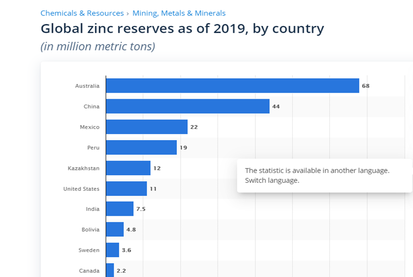 قزاقستان حدود 9.5 درصد منابع روی دنیا را دارد و تقریبا جزء ده تولید کننده اصلی این ماده معدنی در دنیا میباشد. در برخی از منابع حتی میزان ذخایر آن تا 13 درصد کل منابع روی دنیا ذکر شده است.(کل منابع ثابت شده روی در دنیا 1.9 میلیارد تن میباشد) رتبه بندی کشورها به لحاظ دارا بودن ذخایر روی به شرح نمودار ذیل میباشد.