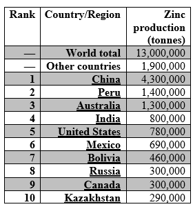 رتبه کشورها در حوزه تولید روی در سال 2019 به شرح جدول ذیل میباشد. قزاقستان در این سال با تولید بیش از 290 هزار( معادل 505 میلیون دلار) در جایگاه دهم تولید روی در دنیا قرار بگیرد.