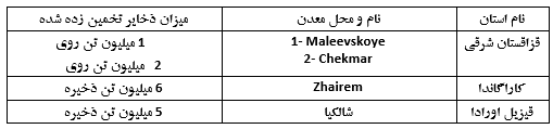 از چهار معدن کشف شده در این منطقه دو معدن Maleevskoye و Chekmar به ترتیب دارای یک و دو میلیون تن روی هستند. در استانهای کارگاندا و قیزیل اوردا منطقه شایرم و شالیکا نیز به ترتیب با 6 و 5 میلیون تن ذخیره روی در حال توسعه میباشند.