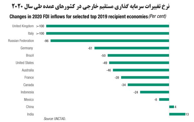 کاهش جذب FDIدر کشورهای توسعه یافته 69%- و در اقتصادهای در حال توسعه 12%- بوده است. آمریکای لاتین و کارائیب 37%- و آفریقا 18%- کاهش داشته، اما در آسیای جنوبی جذبFDI با 10%+ افزایش به 65 میلیارد دلار رسید که بخش عمده آن مرهون هند است.