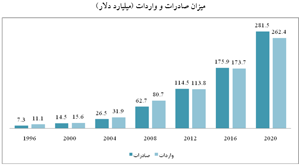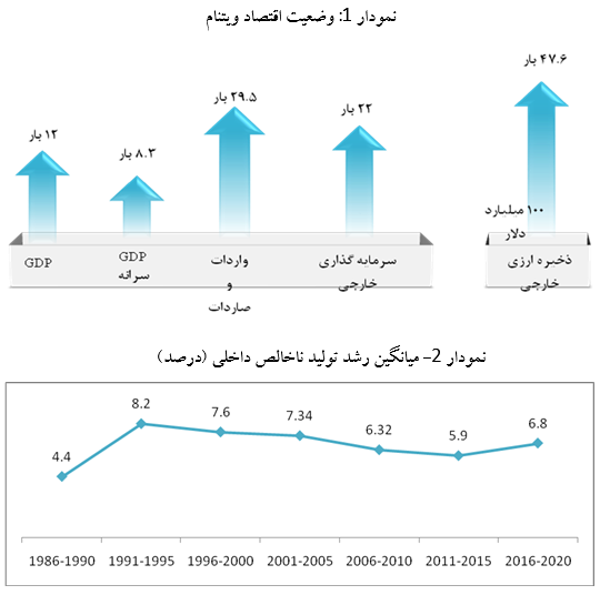اقتصاد کلان ویتنام در دهههای گذشته تقریباً با رشد حدود 7 درصد به صورت پایدار گسترش داشته است و نسبت به 35 سال قبل 12 برابر افزایش یافته است. همزمان، میزان سرانه مردم در تولید ناخالص داخلی 8.3 برابر، صادرات و واردات 29.5 برابر، سرمایه گذاری خارجی 22 برابر و میزان ذخایر ارزی 47.6 برابر شده است که نمودارهای شماره یک و دو به وضوح این موضوع را نشان می دهند.
