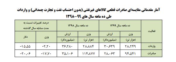 در ده ماهه نخست سال 1399، میزان صادرات قطعی غیرنفتی کشور (به استثنای نفت خام، نفت کوره و نفت سفید و همچنین بدون صادرات از محل تجارت چمدانی) بالغ بر 94.541 هزار تن و به ارزش 28.063 میلیون دلار بوده است که در مقایسه با مدت مشابه سال 1398، کاهشی 17.70 درصدی در وزن و 20.06 درصدی در ارزش دلاری داشته است.