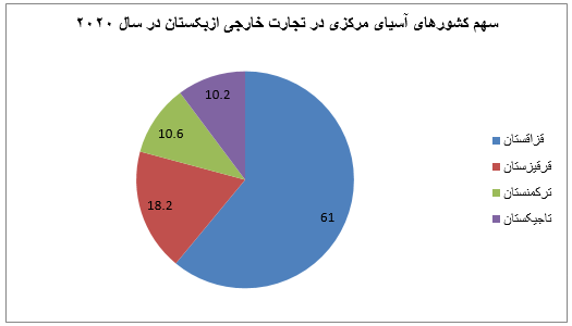 در پایان سال 2020، حجم تجارت خارجی ازبکستان با کشورهای آسیای مرکزی نسبت به سال 2019 اندکی (5.4 درصد) کاهش یافت که این امر با کاهش کلی فعالیت اقتصادی به دلیل شیوع ویروس کرونا بود. با این حال، سهم کشورهای آسیای مرکزی از 12.4 درصد به 13.6 درصد حجم کل تجارت خارجی ازبکستان رسیده است. در نمودار ذیل سهم کشورهای منطقه در تجارت خارجی ازبکستان قابل مشاهد میباشد.