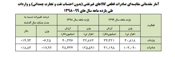 در یازده ماهه نخست سال 1399، میزان صادرات قطعی غیرنفتی کشور (به استثنای نفت خام، نفت کوره و نفت سفید و همچنین بدون صادرات از محل تجارت چمدانی) بالغ بر 103.090 هزار تن و به ارزش 31.198 میلیون دلار بوده است که در مقایسه با مدت مشابه سال 1398، کاهشی 17.92 درصدی در وزن و 18.83 درصدی در ارزش دلاری داشته است.