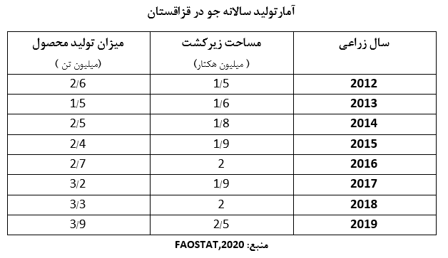 جدول زیر مساحت زمینهای زیرکشت و میزان تولید جو را در قزاقستان در 8 سال گذشته نشان میدهد.