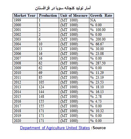 درسال 2020 میزان تولید کنجاله سویا در قزاقستان به 171 هزارتن رسیده است که در مقایسه با سال قبل از آن تغییری نداشته است. بیشترین میزان تغییر در تولید مربوط به سال 2018 بوده است که در قیاس با سال قبل از آن بیش از 10 درصد رشد داشته است. جدول زیر میزان تولید کنجاله سویا در قزاقستان را ظرف 22 سال گذشته نشان میدهد.