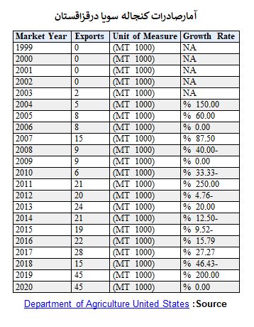 طی سه سال 2018 تا 2020 میزان صادرات کنجاله سویا در قزاقستان به میزان 45 هزارتن درسال بوده است که بیشترین میزان صادرات در 20 سال گذشته محسوب میشود. به این ترتیب مشاهده میشود که حدود یک چهارم کنجاله سویای تولید در قزاقستان صادر میشود. جدول زیر آمار کنجاله سویای صادرشده از سوی قزاقستان ظرف 22 سال گذشته را نشان می دهد.
