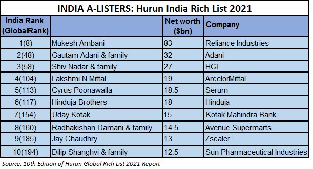 در هند بر اساس ارزیابیهای مختلف، طبقه ثروتمند با شیب قابل توجهی درحال گسترش است. طبق رتبه بندی موسسه هورون، تعداد میلیاردرهای هندی 209 نفر است که 32 نفر آنها مقیم خارج از کشور هستند. آقای موکش آمبانی؛ مالک گروه ریلاینس با 83 میلیارد دلار سرمایه در صدر ثروتمندان این کشور، رتبه دوم آسیا و هشتم جهان قرار دارد. قطام آدانی (مالک گروه ادانی)، شیو نادار (مالک گروه HCL) در رتبههای بعدی هستند. در بین شهرهای هند، بمبئی میزبان بیشترین تعداد میلیاردرها(60 نفر)، و دهلی(40 نفر) و بنگلور(22 نفر) در رتبههای بعدی هستند. مجموع ثروت خالص 10 سرمایه دار اول هند به 252 میلیارد دلار بالغ میگردد که تنها اندکی کمتر از 10% تولید ناخالص داخلی این کشور است. برخلاف چین و آمریکا که منابع ثروت سرمایه داران بزرگ آنها عمدتاً بر صنایع فناورانه و نوین (مانند تجارت الکترونیک و فن آوری اطلاعات) مبتنی است، در هند عمدتاً بر فعالیت های مرسوم و سنتی (مانند تولیدات صنعتی و موسسات مالی) استوار است.