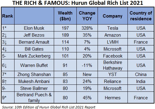 در شرایطی که طی سال 2020 جهان با بحران کرونا و مشکلات انسانی و اقتصادی ناشی از آن مواجه بود، به طور متوسط هر هفته 8 نفر به باشگاه میلیاردرهای جهان اضافه شد. طبق جدیدترین گزارش رتبه بندی موسسه تحقیقاتی هورون در ژانویه سال 2021 تعداد میلیاردرهای جهان برابر 3228 نفر است که 414 نفر نسبت به سال قبل افزایش یافت. مجموع ثروت این افراد نیز با 3.5 تریلیون دلار (32%) افزایش به رکورد 14.7 تریلیون دلار رسیده است. از این میان چین با 1058 میلیاردر در صدر، آمریکا (696 نفر)، هند (177 نفر) و سپس آلمان، انگلیس و سوئیس در رتبههای بعدی قرار دارند.