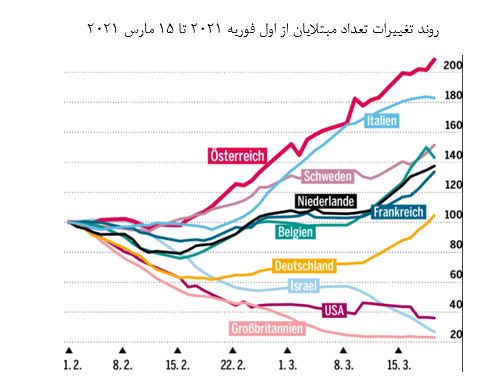 همانطور که از نمودار فوق بر می آید از ماه فوریه 2021 تا نیمه ماه مارس تعداد مبتلایان در اتریش نسبت به کشورهای ایتالیا، سوئد، هلند، فرانسه ، بلژیک، آلمان ، اسرائیل آمریکا و بریتانیا بیشترین افزایش را داشته است. گفته میشود یکی از دلایل این افزایش چشمگیر در اتریش عدم رعایت پروتکل ها توسط مردم و از سوی دیگر کند بودن روند واکسیناسیون در این کشور میباشد.