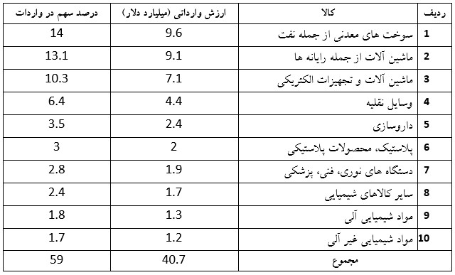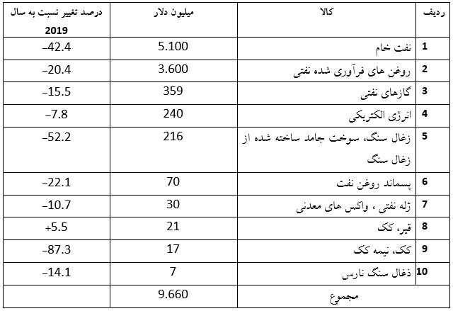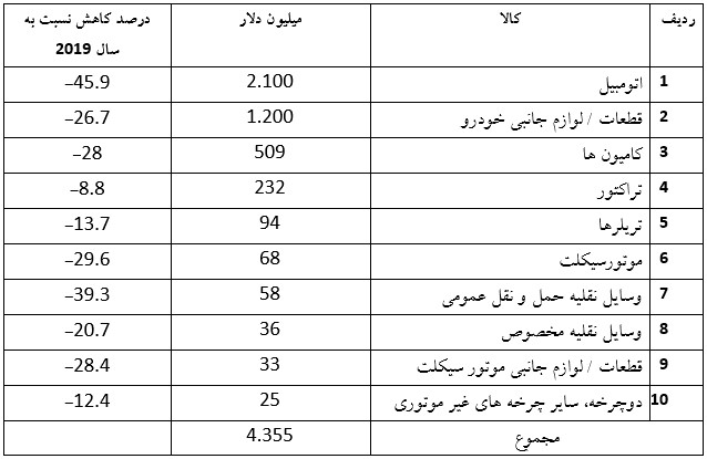 تنها سود حاصل از 2019 تا 2020 مربوط به افزایش 4.5 درصدی مواد شیمیایی متفرقه است. بیشترین افت به میزان37.1 درصد به خودروهای وارداتی اختصاص دارند. کاهش عمده دیگر 34.7% برای سوخت های معدنی از جمله روغن، 19.2% برای ماشین آلات از جمله کامپیوتر و 18.3% برای مواد پلاستیکی و موارد ساخته شده از پلاستیک بود.