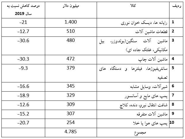 بیشترین صرف هزینه در واردات زیر مجموعه ماشین آلات از جمله رایانه در سال 2020 عبارتند از: