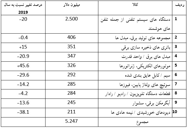 در مجموعه فوق، خرید موتورهای الکتریکی و ژنراتورها (با افزایش 45.6 درصدی) و باتریهای ذخیره سازی برقی (با افزایش 15 درصدی) از 2019 تا 2020 رشد داشته است.