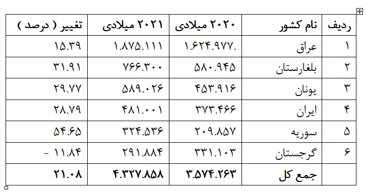 - جدول صادرات ترکیه به همسایگان خود در سه ماه نخست سال 2021 در مقایسه با مدت مشابه در سال 2020 میلادی: ( 1000 دلار )
