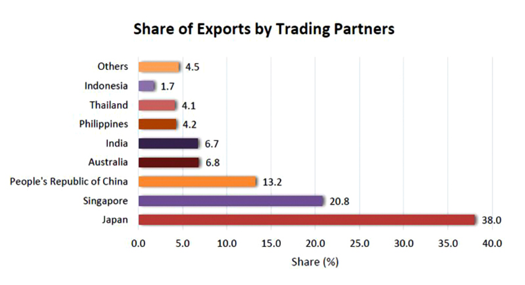 در همین حال، ارزش کل واردات برونئی در ژانویه 2021 از 608.8 میلیون دلار برونئی در ژانویه 2020 به 702.8 میلیون دلار برونئی افزایش یافت که عمدتا ناشی از افزایش واردات سوخت های معدنی و به دنبال آن ماشین آلات و تجهیزات حمل و نقل توسط شرکت های سرمایه گذاری مستقیم خارجی به عنوان واردات برای تولید و ساخت بود. پنج کالای عمده وارداتی برونئی در ماه ژانویه 2021 شامل سوخت های معدنی (45.3 درصد) ، ماشین آلات و تجهیزات حمل و نقل (23.6 درصد) ، مواد غذایی (9.1 درصد) ، مواد شیمیایی (8.1 درصد) و کالاهای تولیدی (7.6 درصد) بوده است. ، بیشترین سهم واردات از شرکای تجاری را کشورهای امارات متحده عربی (33.7 درصد) ، مالزی (24.1 درصد) و سنگاپور (11 درصد) داشته اند.