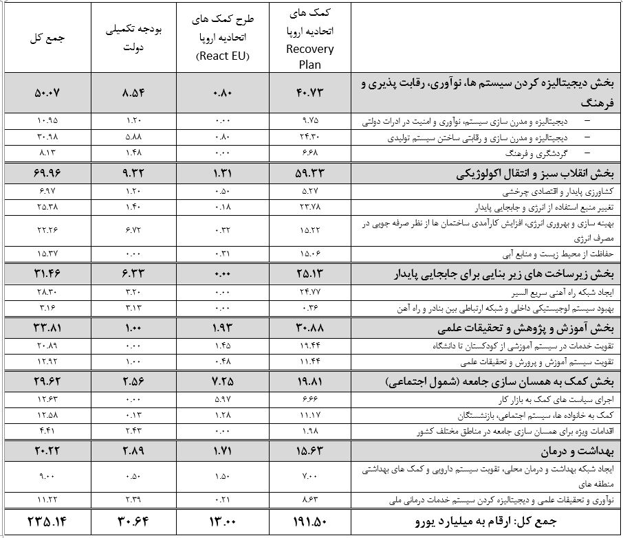 1) 191.5 میلیارد یورو کمک های اتحادیه اروپا (Recovery Found) که از این میزان 138.5 میلیارد به طرح های جدید و 53 میلیارد یورو به طرح هایی در حال اجرا اختصاص داده خواهد شد.