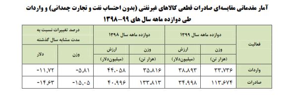 در یازده ماهه نخست سال 1399، میزان صادرات قطعی غیرنفتی کشور (به استثنای نفت خام، نفت کوره و نفت سفید و همچنین بدون صادرات از محل تجارت چمدانی) بالغ بر 113.674 هزار تن و به ارزش 34.998 میلیون دلار بوده است که در مقایسه با مدت مشابه سال 1398، کاهشی 15.05 درصدی در وزن و 14.63 درصدی در ارزش دلاری داشته است.