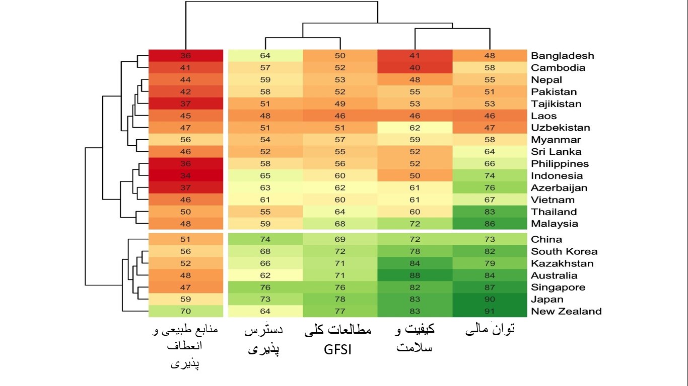 نمودار زیر خلاصه نمودار GFSI برای منطقه آسیا-اقیانوسیه در سال 2020 را نشان می دهد. ردیف های سبز در نمودار متعلق به کشورهایی هستند که تقریباً در همه ابعاد امنیت غذایی امتیاز مطلوبی دارند.
