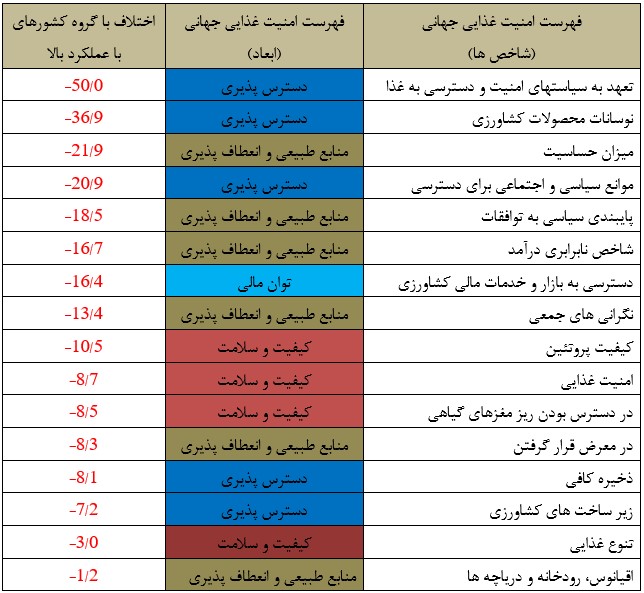در جدول زیر شاخص های امنیت غذایی و علت نپیوستن مالزی به کشورهای پیشرو در این بخش آورده شده است.