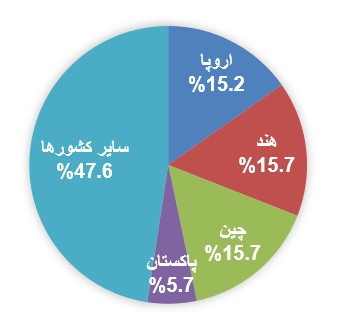 در نمودار زیر میتوان به تفکیک بزرگترین بازارهای هدف روغن پالم مالزی در جهان را مشاهده کرد.